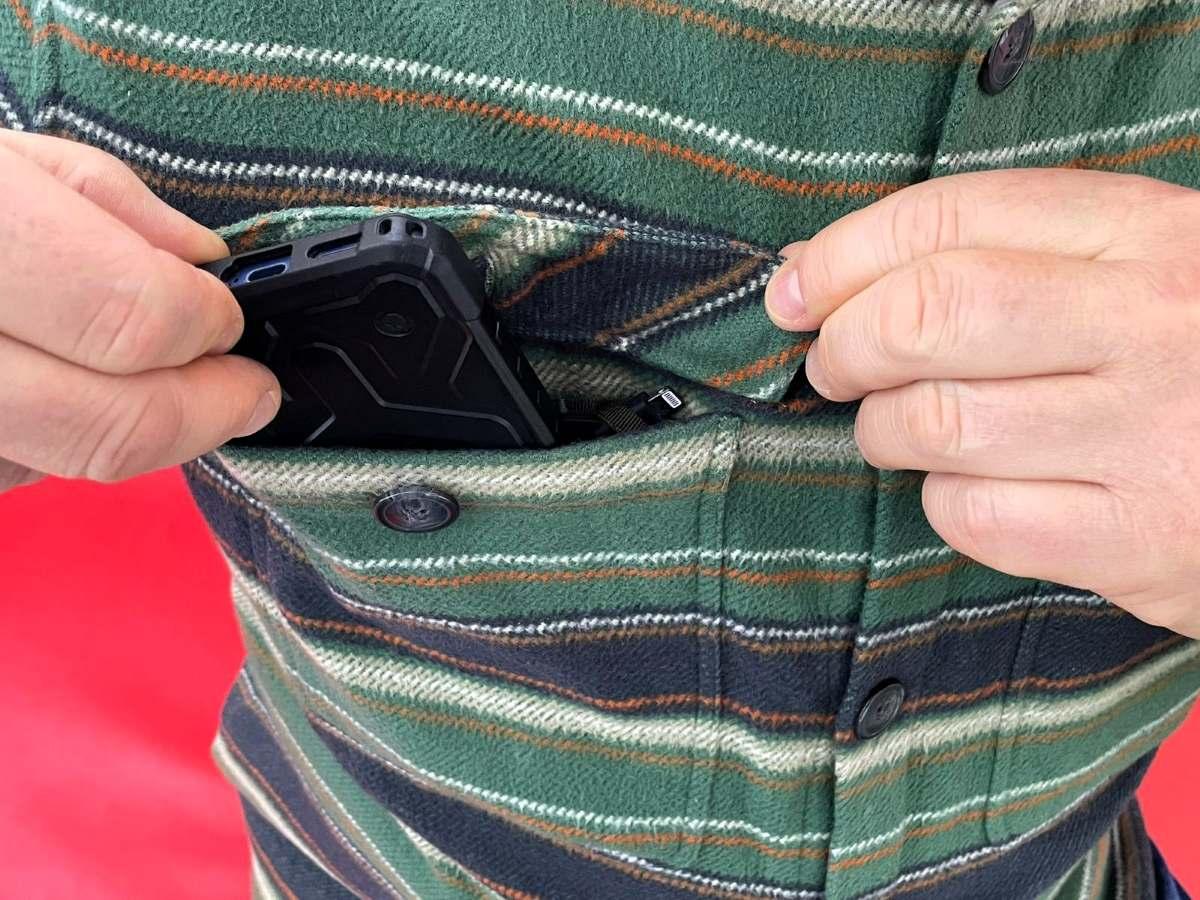 Früher nutzten die Navajos Rauchzeichen, heute hingegen greifen sie auf moderne Kommunikationsmittel zurück. Auch in Zeiten, in denen man mehr Bluetooth-fähige Kopfhörer trägt, sind die beiden Brusttaschen auf der dem Körper zugewandten Seite praktisch, da sie jeweils über einen Kabeldurchlass verfügen, um Lade- oder Kopfhörerkabel durchführen zu können.