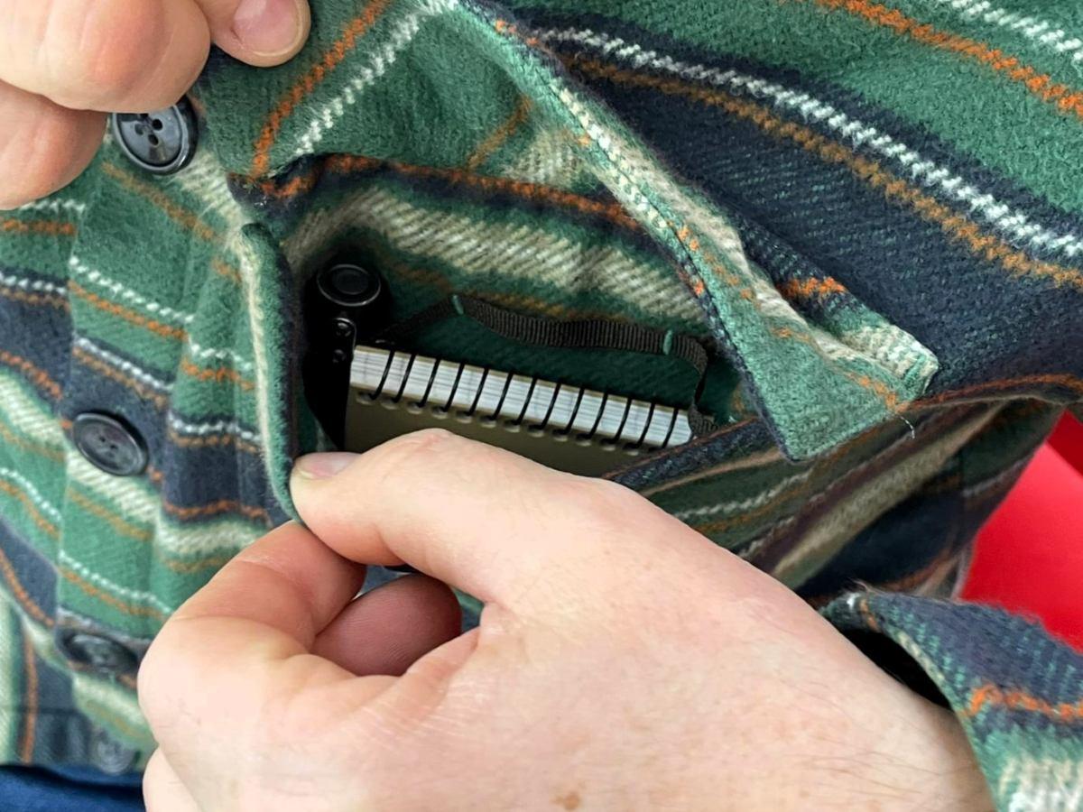 Darüber hinaus ist die linke Brusttasche mit einer Öffnung in der Flappe versehen, um Stifte oder eine Brille einzufädeln.